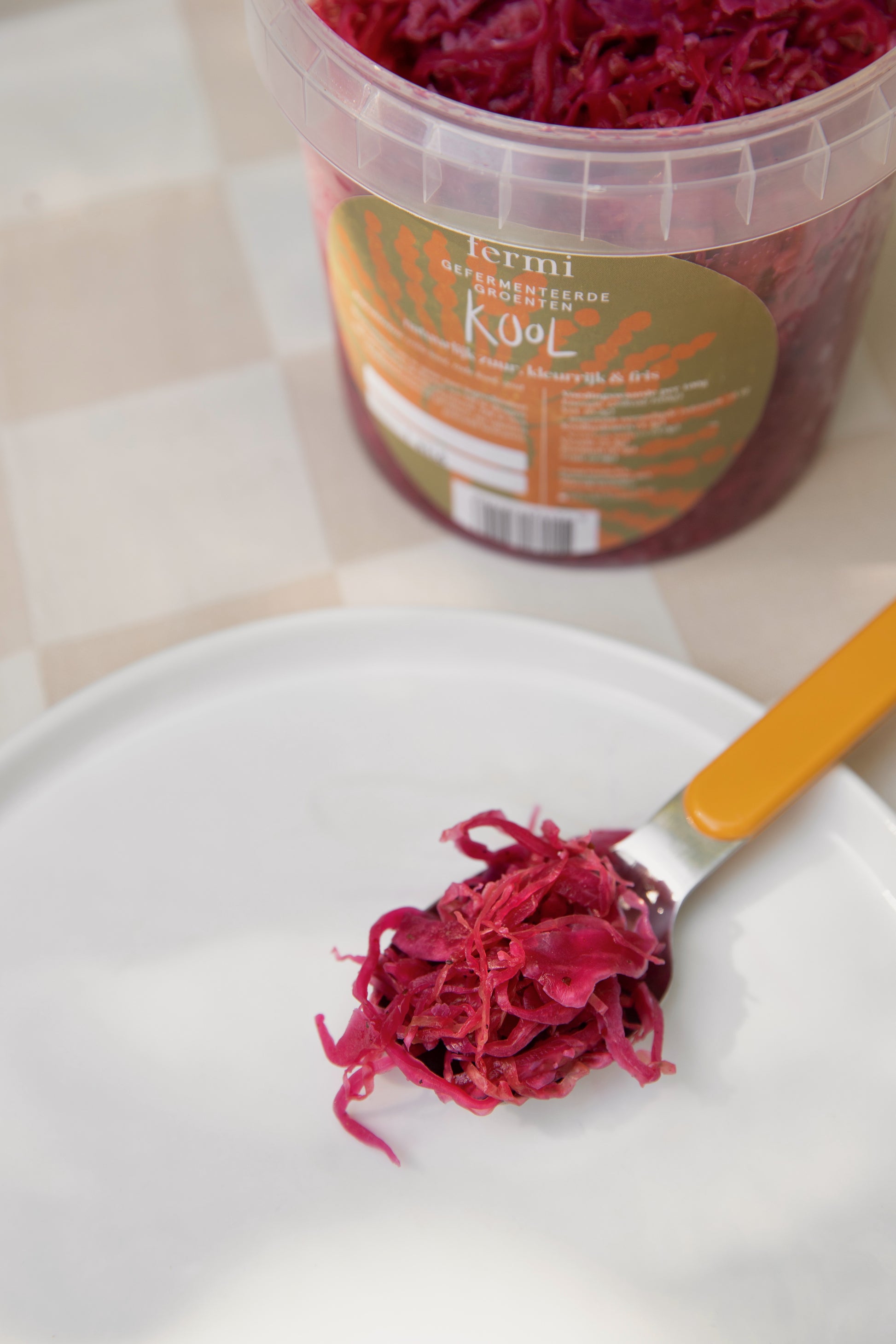 Frisse Waldorf salade met venkel, appel, en onze Fermi Rode kool en Rogge miso.Afgewerkt met rozijnen, knapperige amandel en verse peterselie.